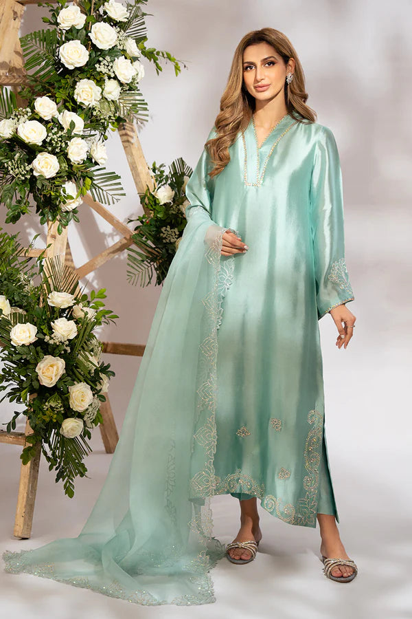 PRODUCT DETAILS 3PC Ready to wear Color: Turquoise Fabric: Sheesha Silk and Organza In awe with this powder turquoise...