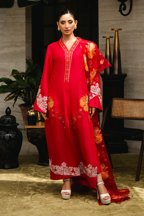PRODUCT DETAILS 3Pc Ready to wear Colour: Red Fabric: Silk & Organza Immerse yourself in classic sophistication...