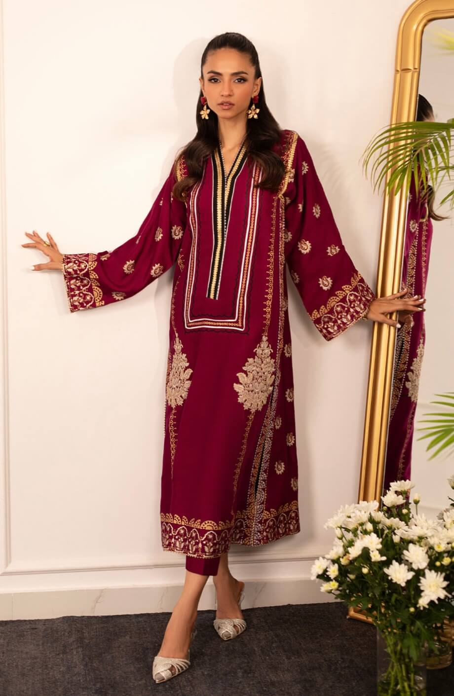 PRODUCT DETAILS 2Pc Ready to wear Color: Deep Crimson Fabric: Cotton Net Work Details: Detailing Long silhouette cotton...