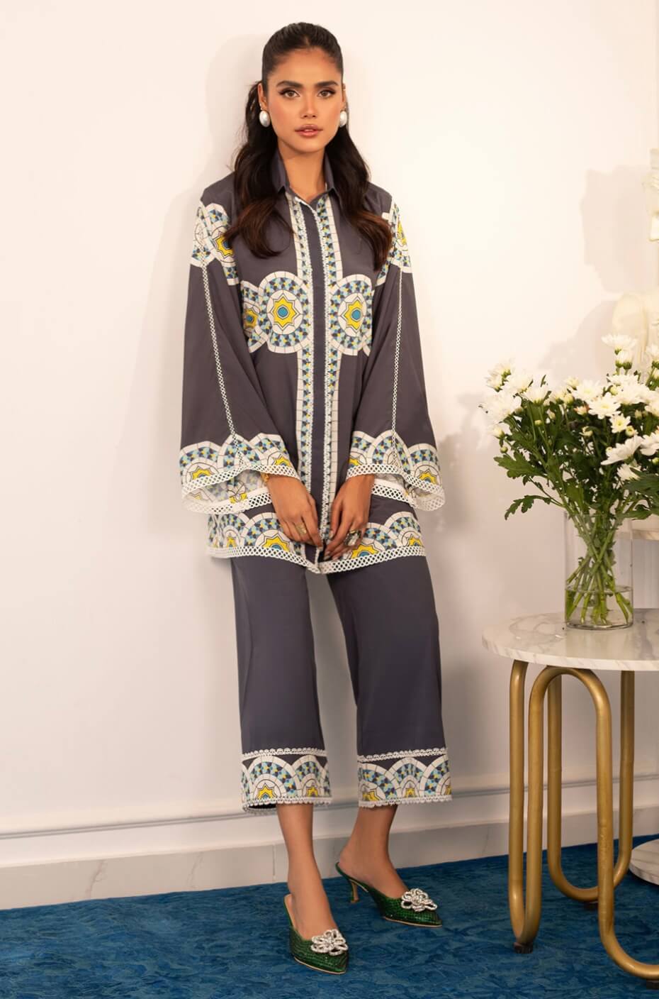 Quirky, trendy yet elegant co-ord set on crepe silk featuring balanced and carefully crafted prints, enhanced with lace details, is a must-have in your closet this summer.