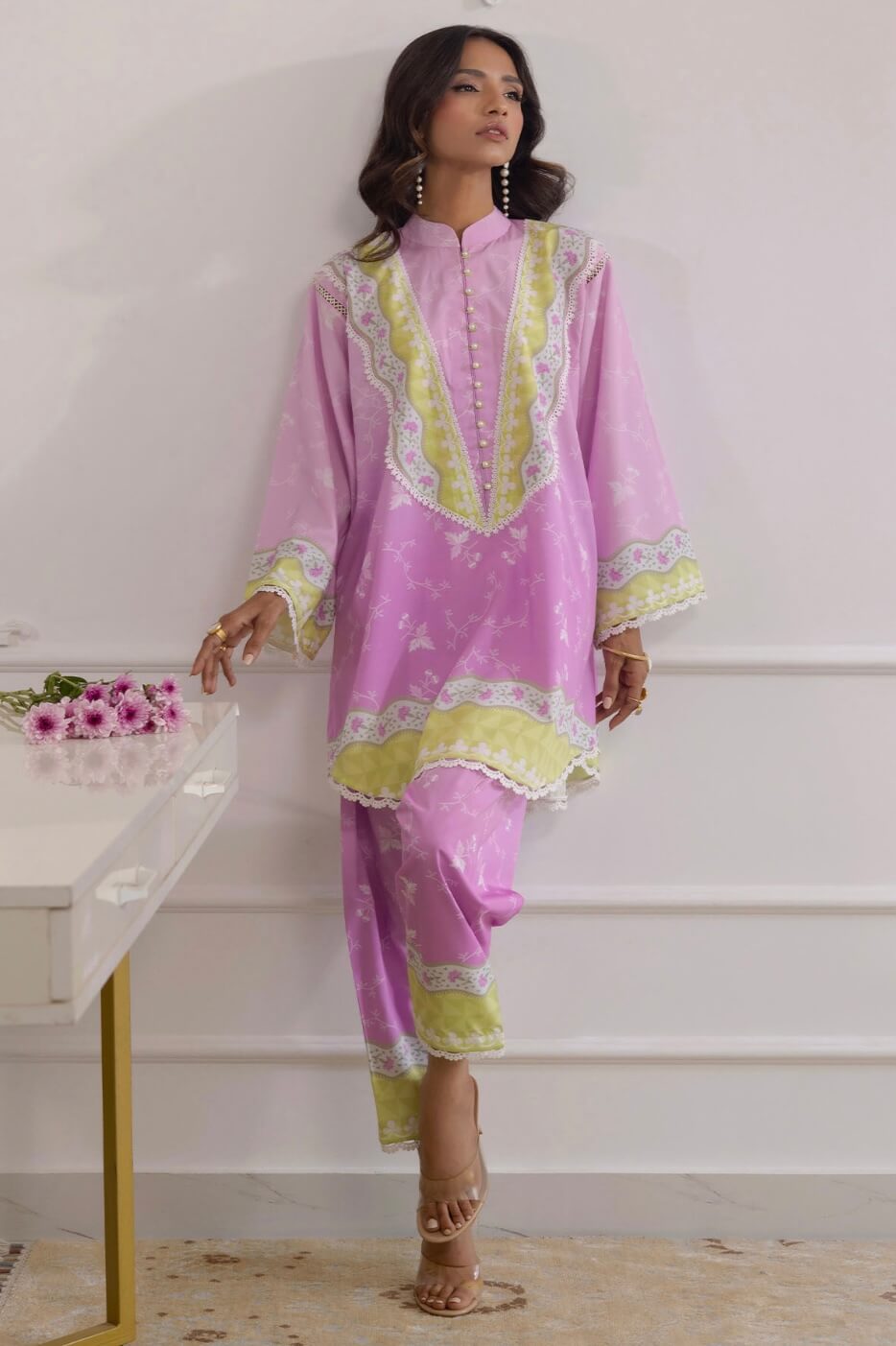 Knee length shirt box cut shirt in soothing lilac and mints featuring self floral printed details. The neckline is adorned with loop and pearls details. The rounded hem is enhanced with crochet laces and the shirt can be paired with printed shalwar to create a complete look.