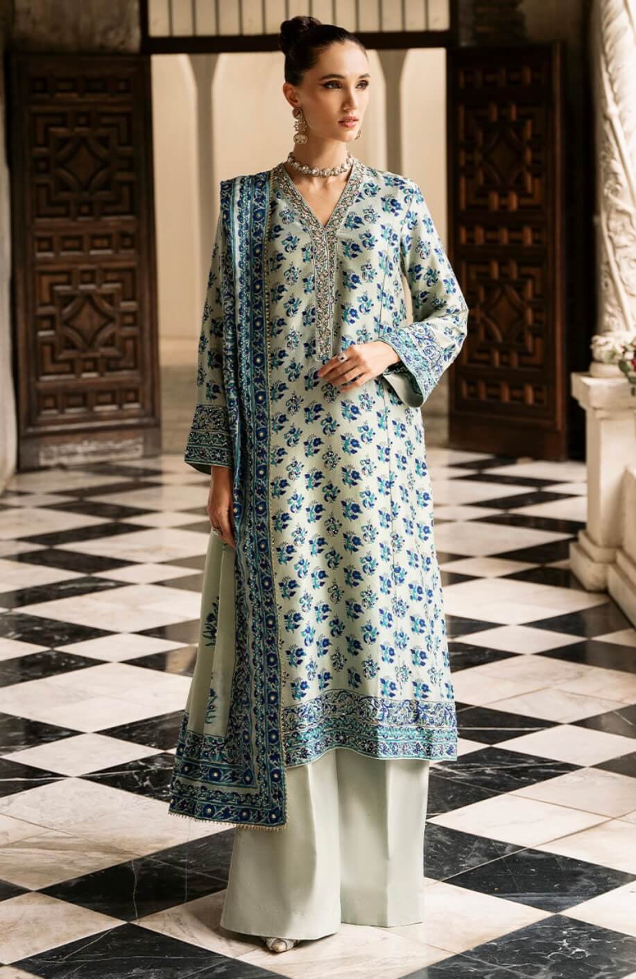 This mesmerizing ensemble is a dreamscape. It blends captivating textures and colors. The long, raw silk shirt in taupe and green features a meticulously detailed neckline adorned with sparkling stones, cut dana, and pearls. A captivating discharge print in shades of blue dances across the fabric, creating an ethereal dreamscape. Flowing izaar pants complete the look, while a luxurious medium silk dupatta adds a final touch of elegance