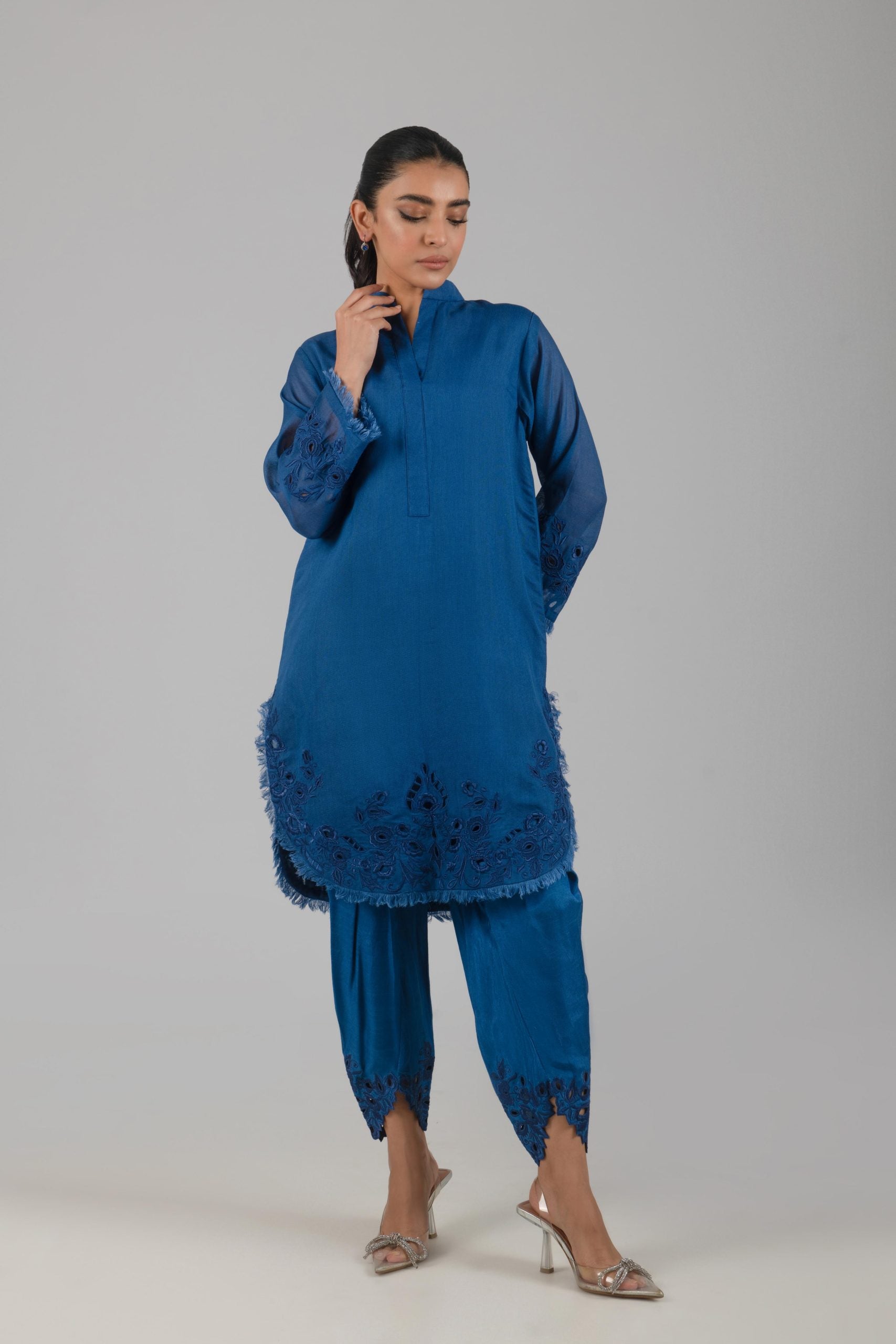 A beautiful monotone ensemble featuring cutwork details on the sleeves and the bottom, enhanced by hem details to make a statement wherever you go. Comes with matching cutwork tulip shalwar.