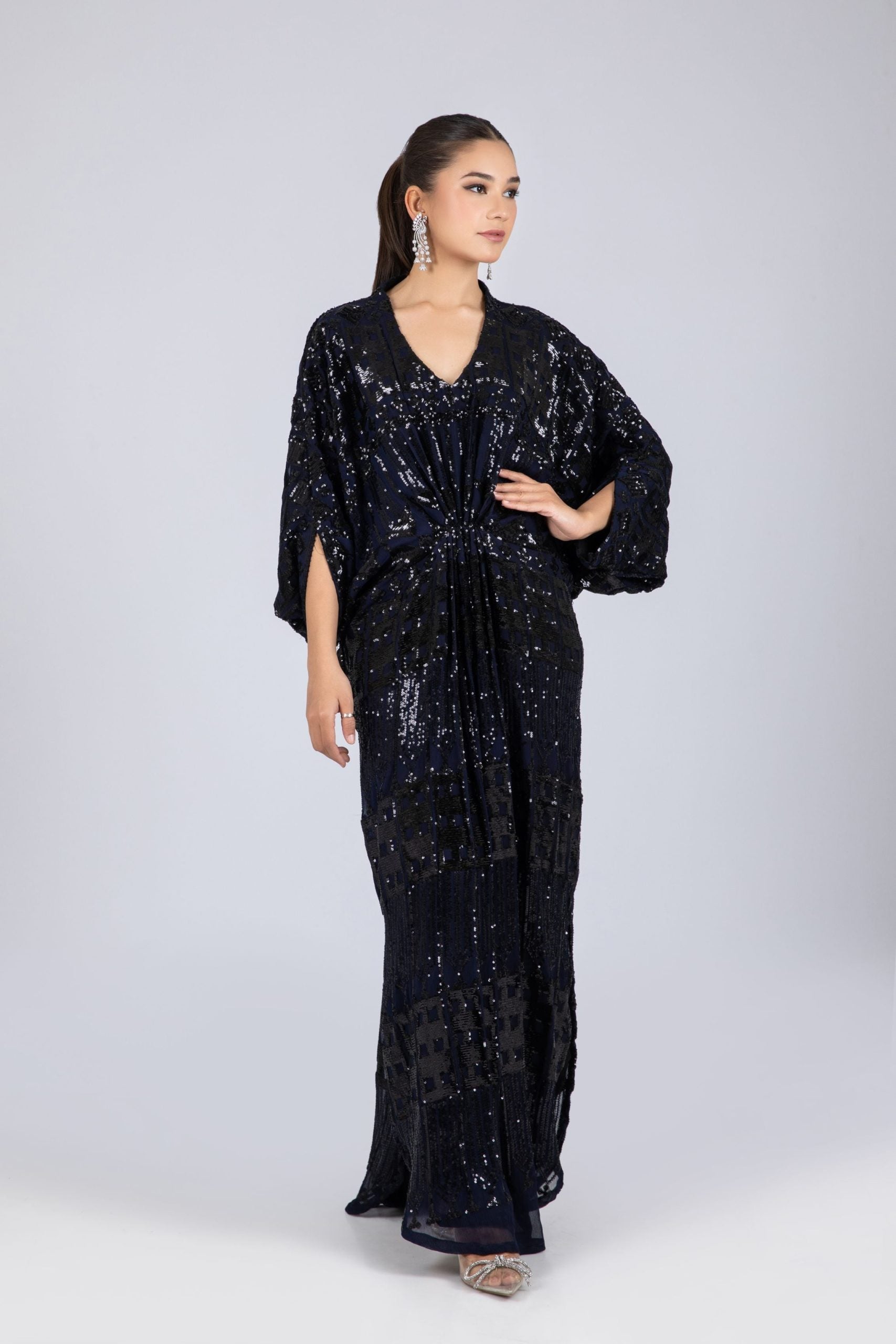 PRODUCT DETAILS Navy blue chiffon Kaftan slathered in liquid black sequins. Comes in one size fits all....