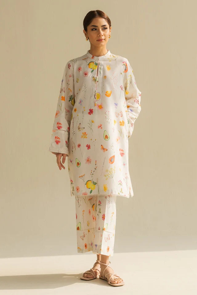 PRODUCT DETAILS 2Pc Ready to wear TOP- CAMBRIC BOTTOM- CAMBRIC This white kurta features a playful print...