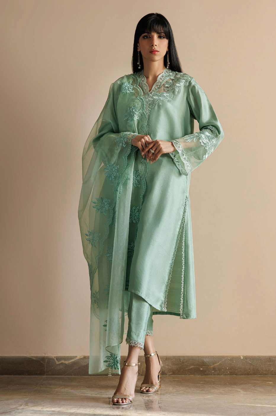 PRODUCT DETAILS 3Pc Ready to wear Fabric: Pakistani Raw silk Work details: Embroidered A raw silk tunic with delicate...