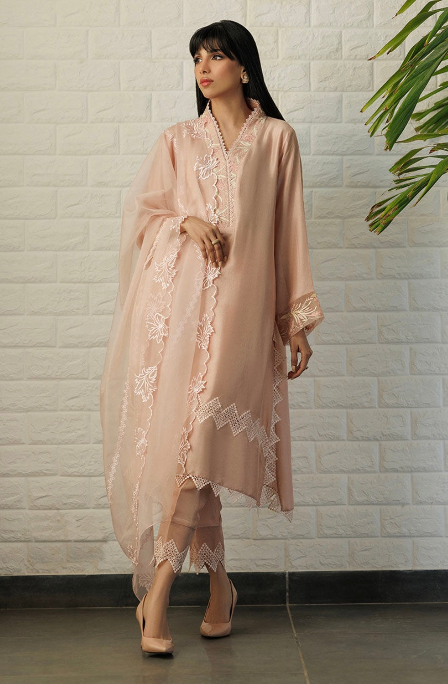 A raw silk tunic featuring aari embroidery on the neckline and sleeves finished with lace. It is paired with straight pants finished with organza and lace. The outfit is paired with an organza dupatta.