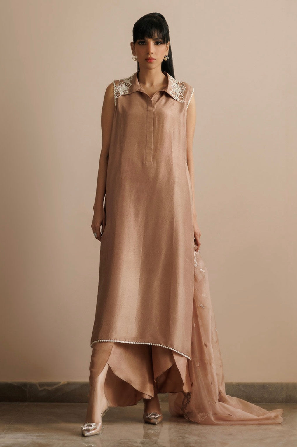 A raw silk tunic with cutwork collar paired with wrap around pants. It is paired with an embroidered dupatta
