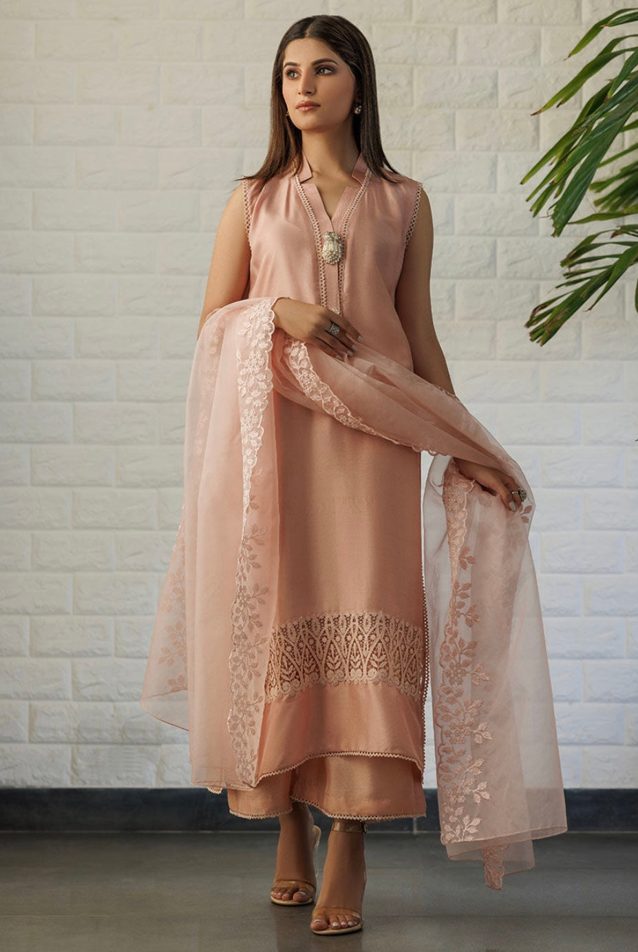 PRODUCT DETAILS 3Pc Ready to wear Fabric: Pakistani Raw Silk Work details: Lace A raw silk tunic featuring cutwork...