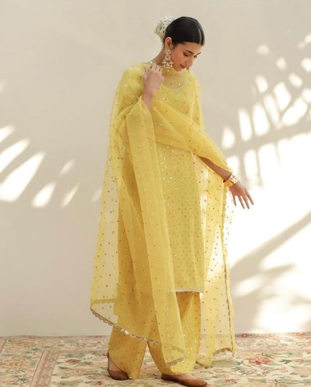 Resham, Tilla and sequins of spray embroidery on silk and sequins of spray on organza dupatta with hand work border.