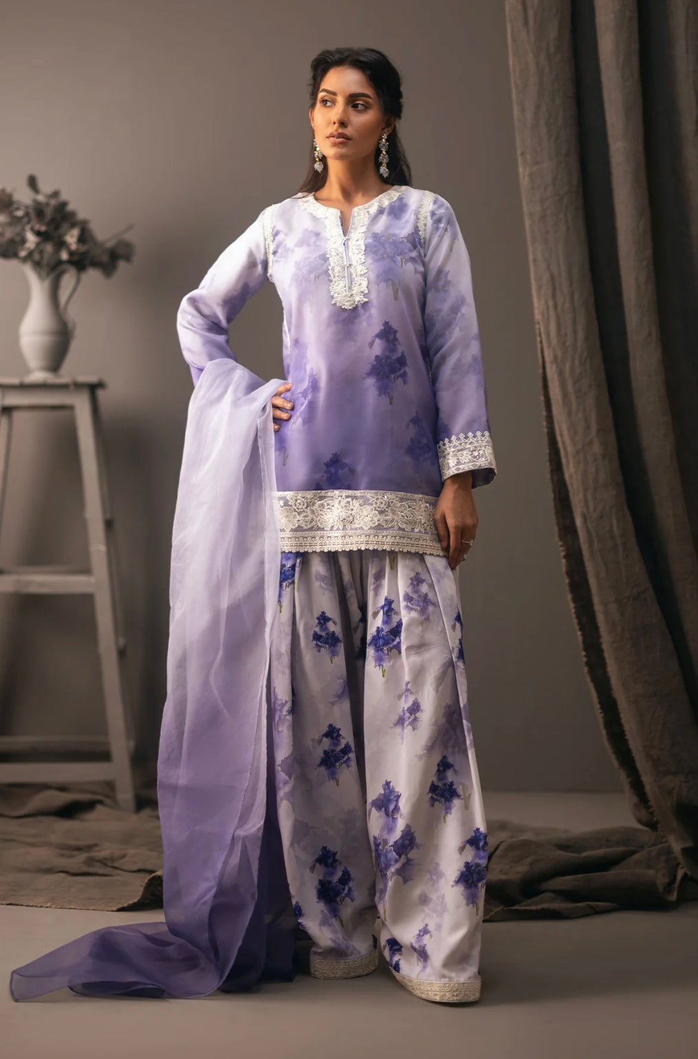 A beautifully botanical-printed short kameez and shalwar. The kameez showcases elegant embroidery and is enhanced with an additional layer of gradient organza, adding an exquisite touch. The shalwar is designed with a bordered end for a refined finish. Complementing the outfit is a gradient organza dupatta, completing the look with grace and sophistication.