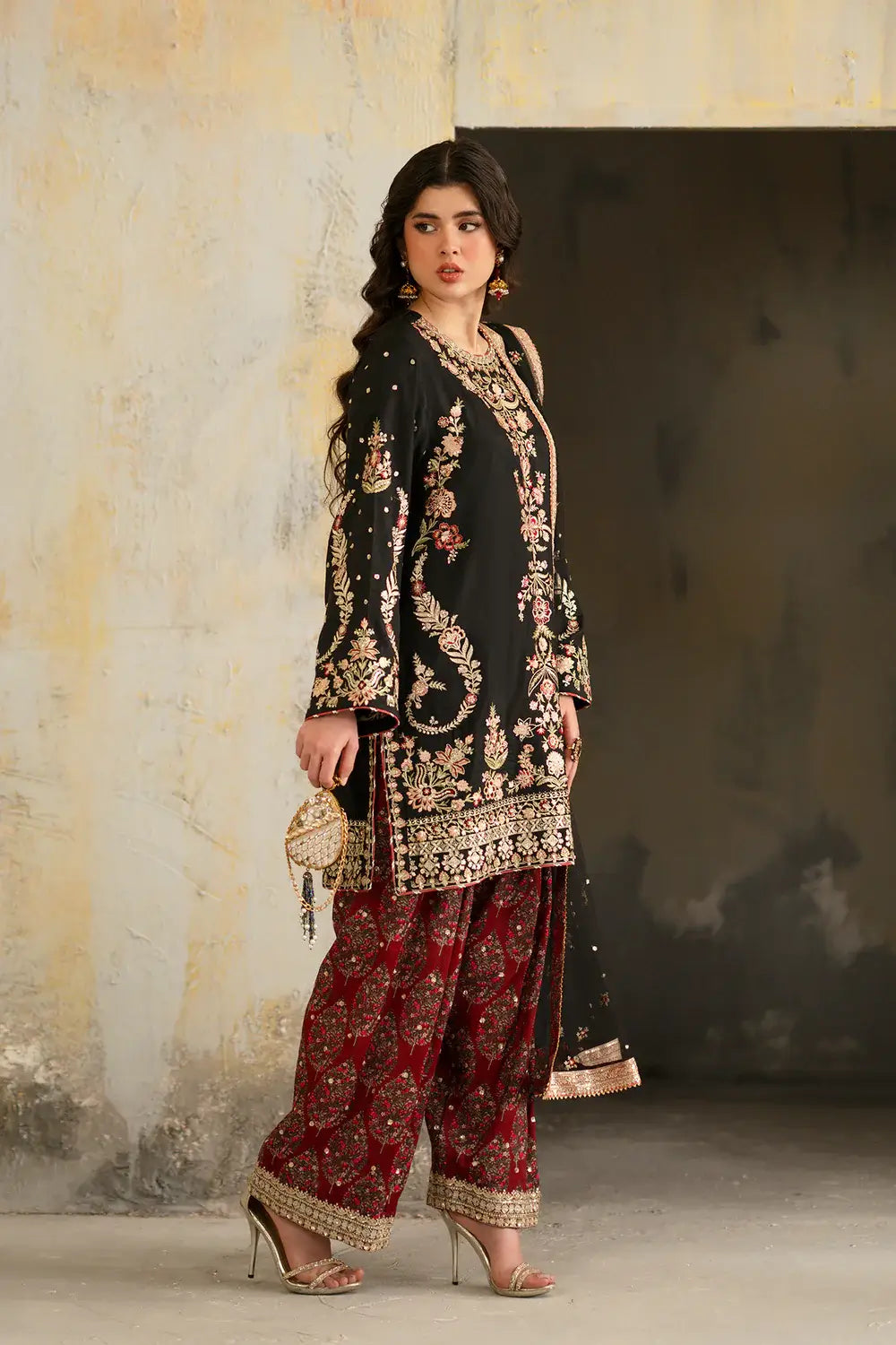 Command attention in this opulent three-piece embroidered suit, a masterclass in festive elegance. The black tunic features a regal round neckline and is lavishly adorned with intricate floral embroidery in soft gold and pink hues that cascade down the bodice and hem. It is perfectly paired with deep maroon wide-leg shalwar, showcasing an all-over traditional motif and a stunning embroidered border at the ankles. Completing the ensemble is a delicate black net dupatta with shimmering gold-lace edges. This high-fashion look is the definitive choice for grand evening celebrations, blending heritage craftsmanship with contemporary grace.