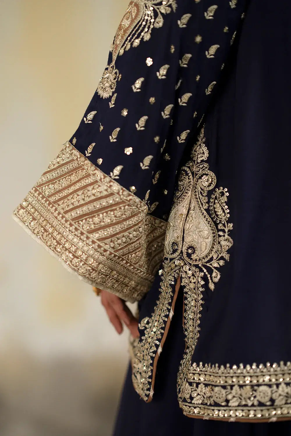 Embrace regal elegance with this stunning two-piece embroidered suit, presented in a deep navy blue palette. The mid-length tunic features an intricate central placket and is lavishly adorned with traditional gold sequin work, showcasing majestic paisley and floral motifs. Shimmering sequins are delicately scattered across the shirt, while broad, ornate borders define the hem and wide sleeves for a polished finish. Paired with coordinating draped culotte trouser that ensure a graceful silhouette, this ensemble is the definitive choice for grand evening festivities or formal celebrations.