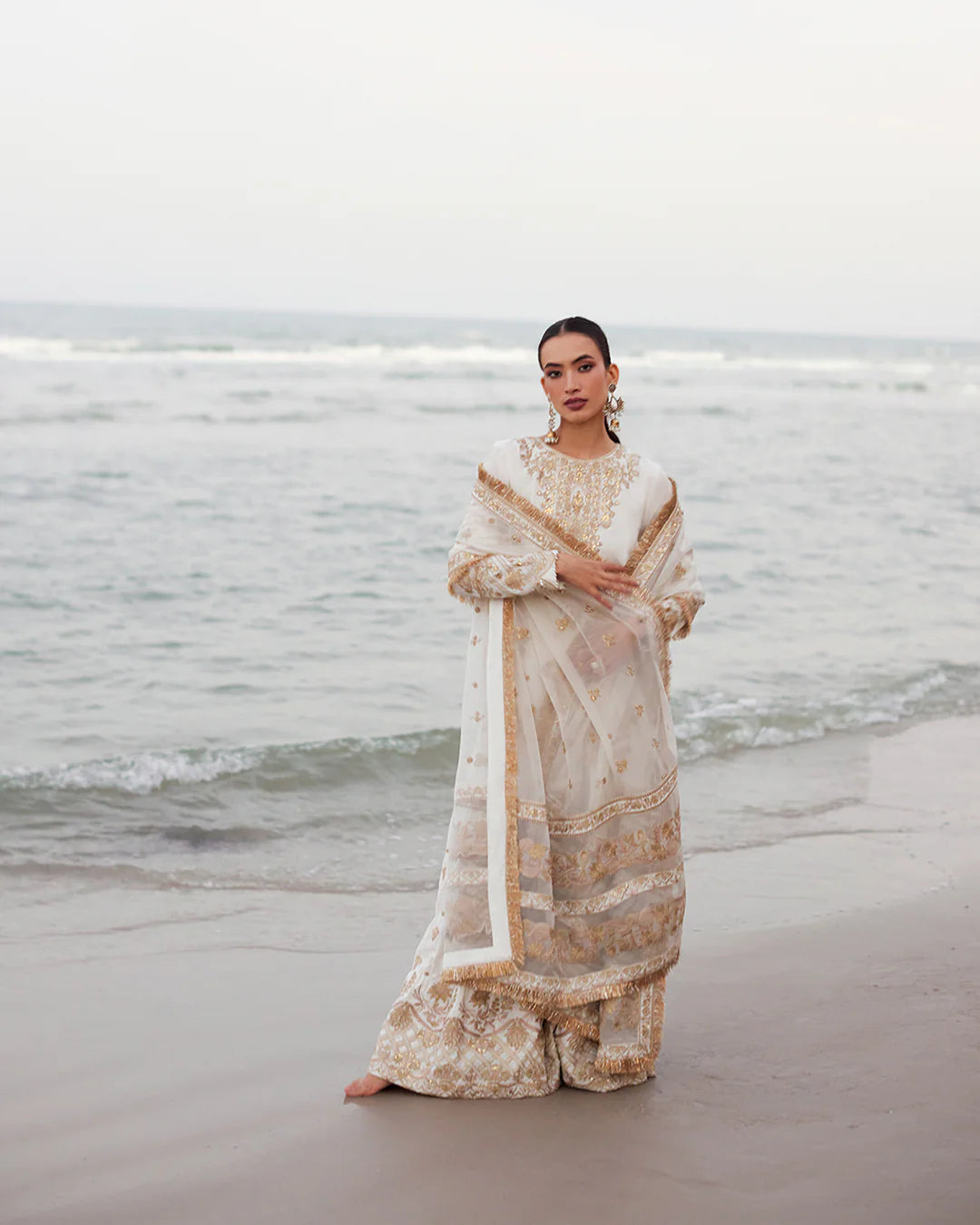 Bathed in an off-white celestial glow, Mirhana showcases intricately patterned floral motifs of Mughal art on diaphanous patches encrusted with golden sequins. Cambric lawn bottom and the daintily accented sheer organza dupatta lend a lustrous sheen to the jora, making it the ultimate expression of unbridled luxury.
