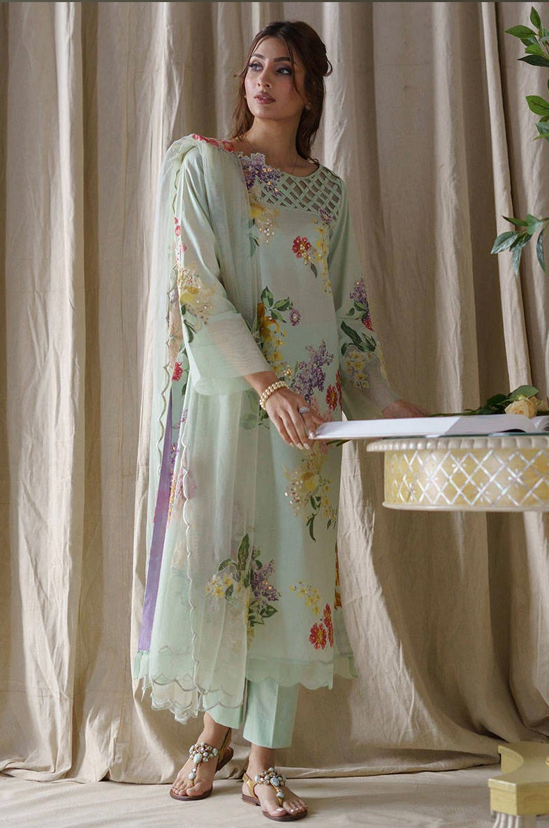 Bring some joy with a hint of sparkle on a scorching hot day. This cool aqua printed cotton shirt is enhanced by subtle sequence work, organza detailing on sleeves and the hem as well as a hand crafted trellis neckline. Can be paired with an appliqued net dupatta and plain pants.