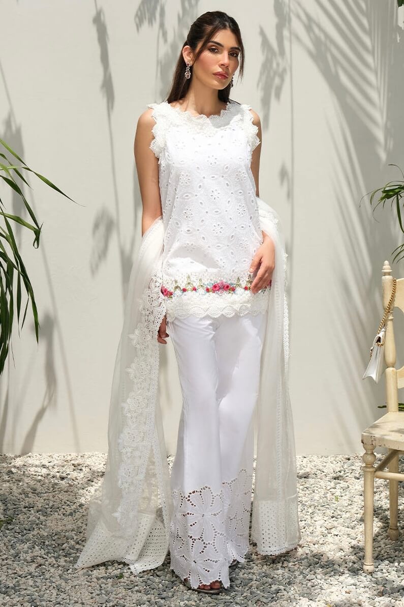 PRODUCT DETAILS 3Pc Ready to wear Color: White Fabric: Cotton Work details: Embroidered Our signature, floral, French...