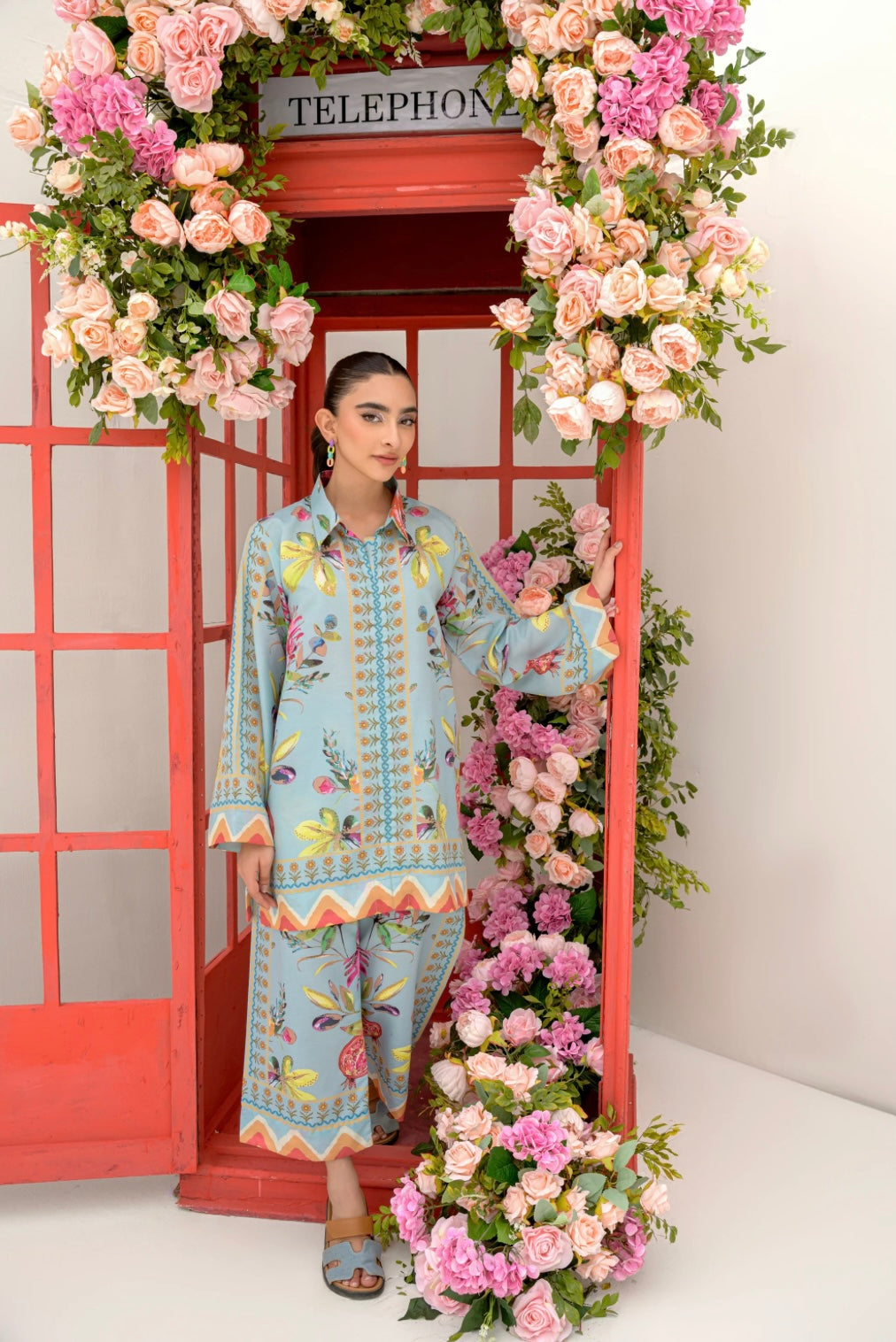 SOHO is an in-house, digitally printed ensemble crafted from a luxurious blended lawn. Designed for effortless summer elegance, its crease-free fabric ensures both comfort and style. The set features a contemporary-cut shirt paired with chic culottes, offering a modern yet timeless silhouette. Adorned with intricate digital prints of delicate pomegranates and an array of cut flowers, the design comes to life in a serene palette of ice blue, cranberry and lemon—evoking the beauty of nature with a fresh, artistic touch.