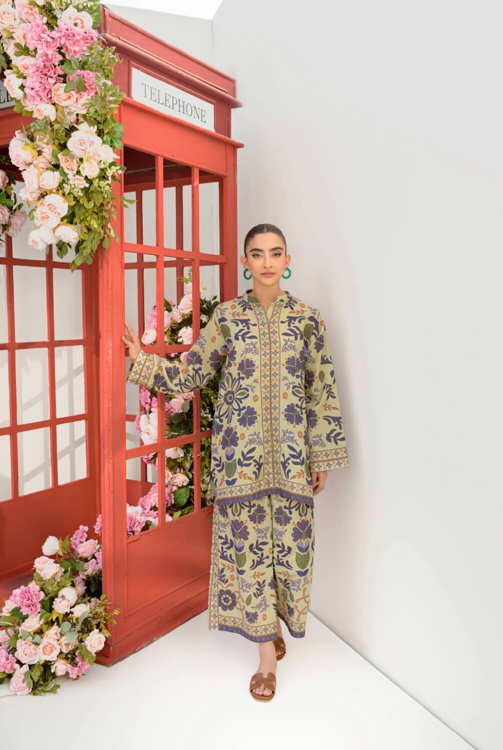 Sol is an in-house, digitally printed ensemble crafted from a luxurious blended lawn. Designed for effortless summer elegance, its crease-free fabric ensures both comfort and style. The set features a contemporary-cut shirt paired with chic culottes, offering a modern yet timeless silhouette. Adorned with intricate digital prints of delicate shells and an array of cut flowers, the design comes to life in a serene palette of pistachio, blue, and rust—evoking the beauty of nature with a fresh, artistic touch.