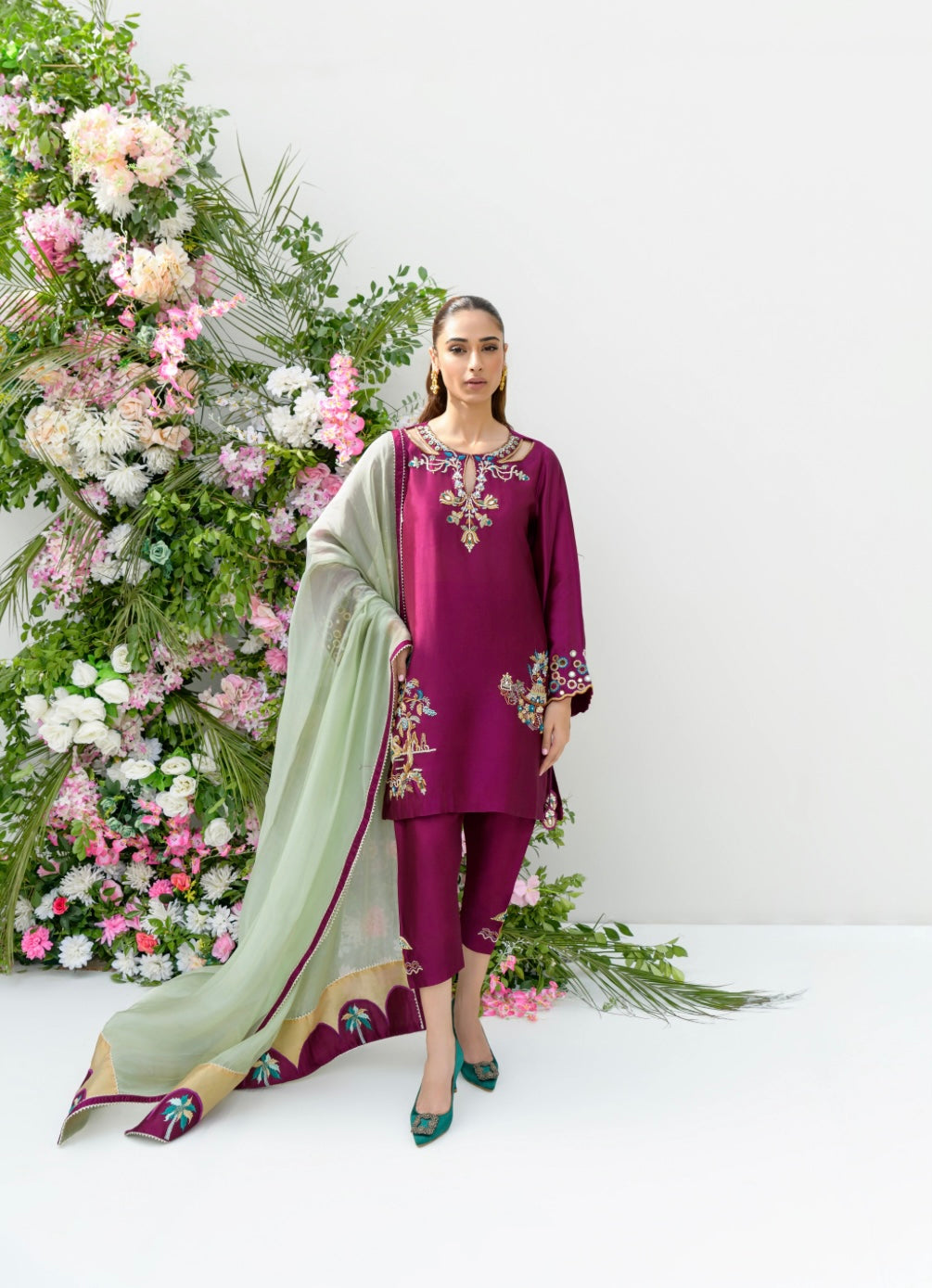 This outfit features a deep plum violet-colored short shirt that exudes a rich and regal hue. The shirt is paired with skinny, modern shalwar, which is designed with a striking flamingo motif along the edge, making it a bold statement piece. The ensemble is completed with a sage green dupatta, which is adorned with palm tree embellishments along its borders, adding a touch of tropical charm and visual interest. The combination of colors and thematic embroidery creates a sophisticated yet eye-catching look.