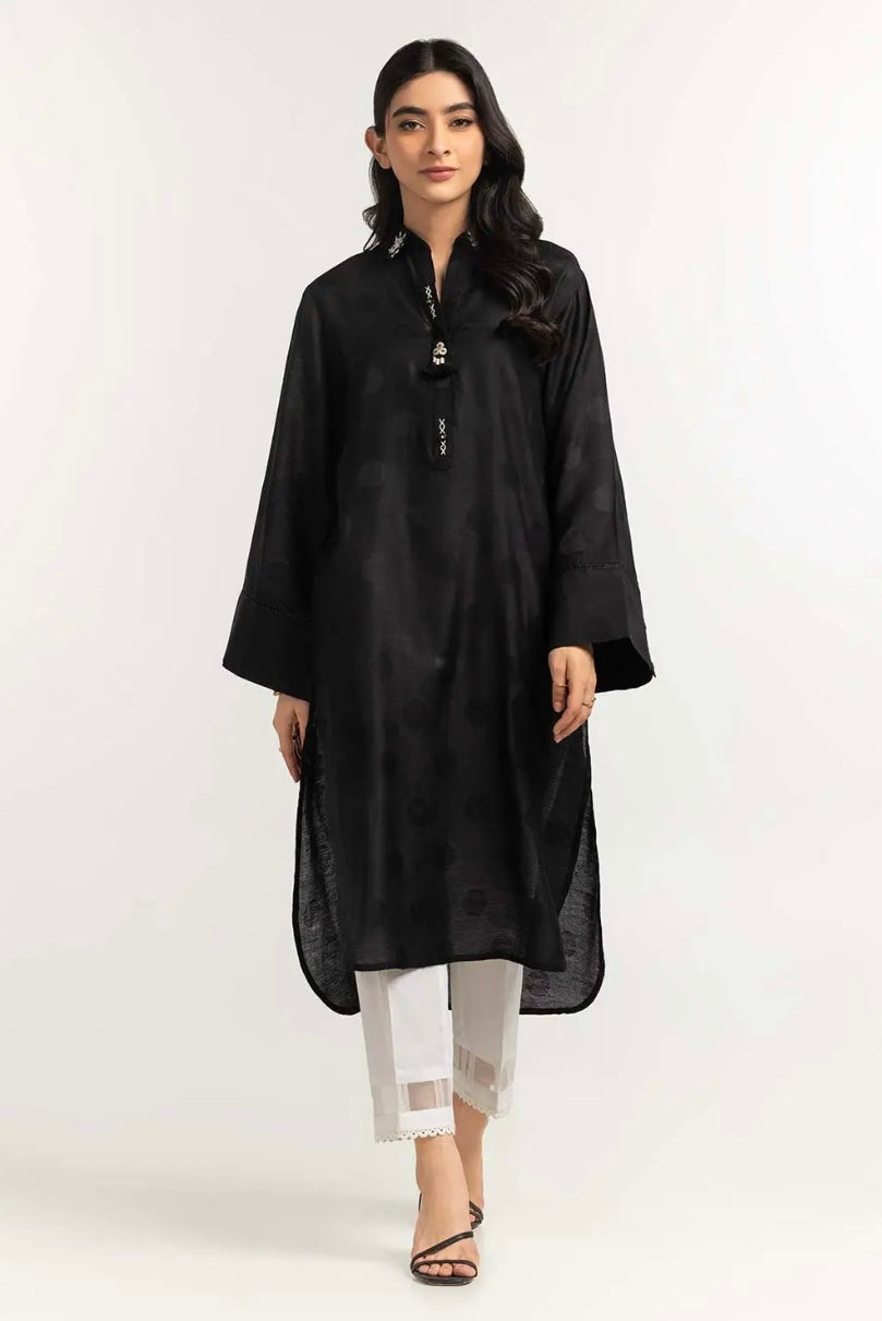 Rejoice in style with this black-dyed self-jacquard shirt, featuring a V-neck with an embellished placket, a high-low hem style, and flappy, stylish sleeves.