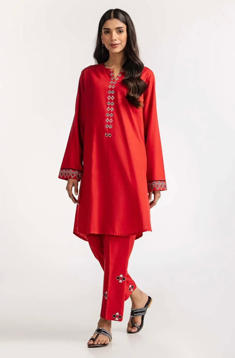 Style yourself in the best fashion with this 2 PC red dyed suit featuring a round neck with a slit cut, embroidery around the placket and sleeves, paired with matching straight trousers to complete the look.