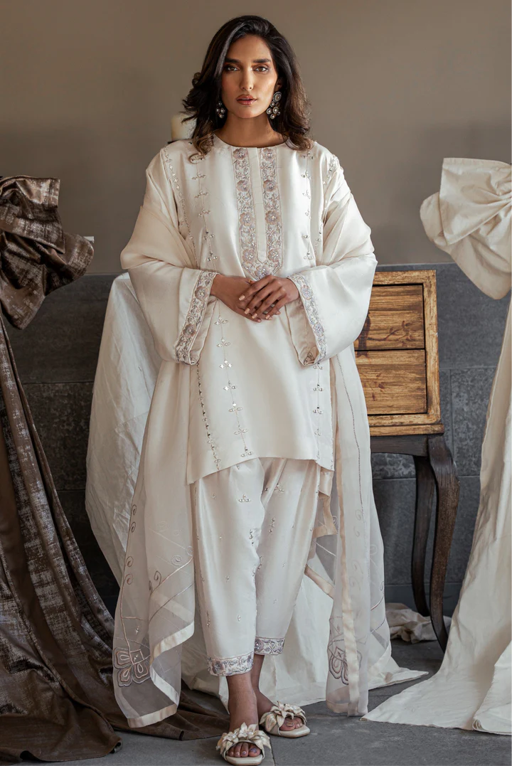 The shirt & pants is in pure raw silk fabric in a crisp white wtih intricate embroidery & sparkly mirror work.