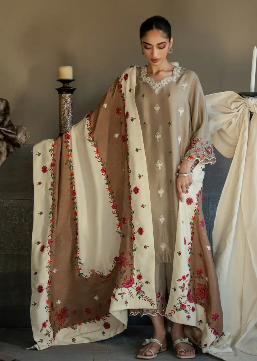 The dupatta is in a premium woven silk fabric in a sophisticated tan & cream to compliment the shirt/pant, which completes the Meerza suit to a luxury occasion wear.