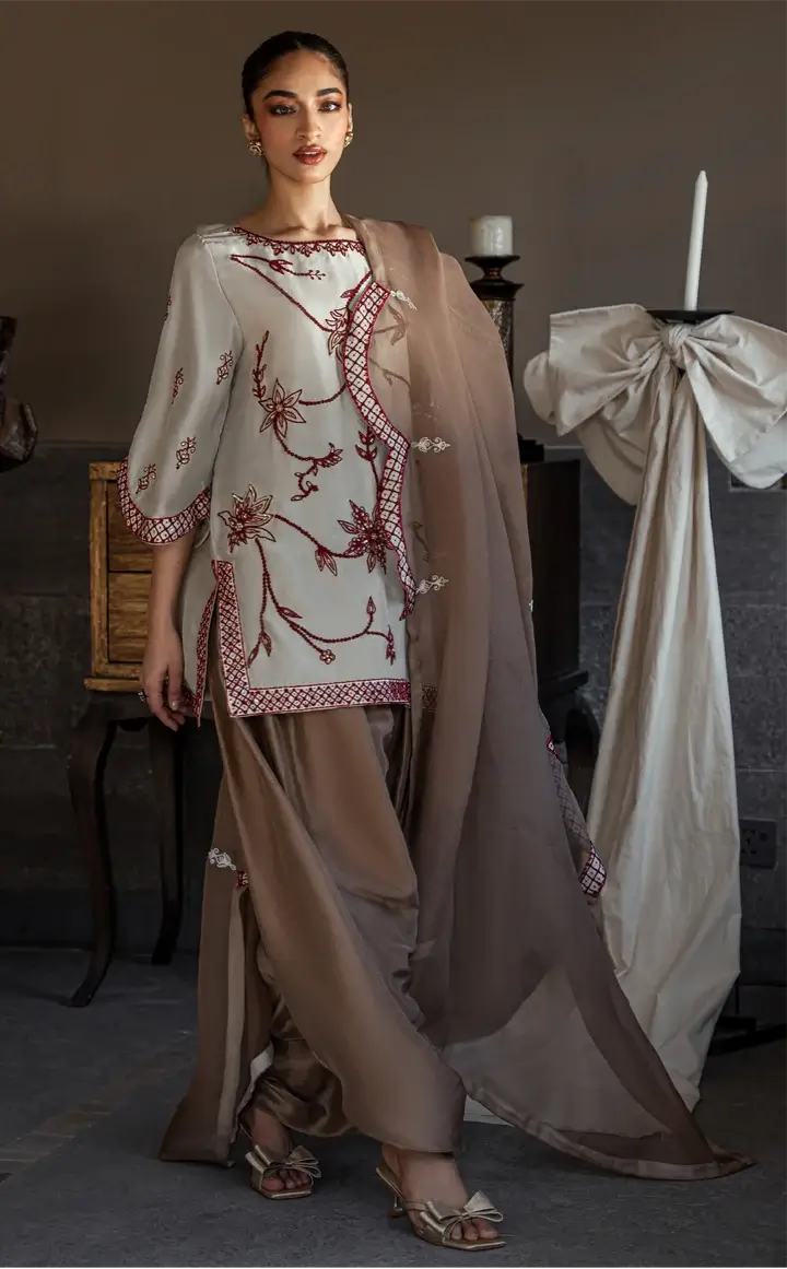 The oversized pants in a contrasting beige is a tailored designer fit to compliment the shirt & dupatta.