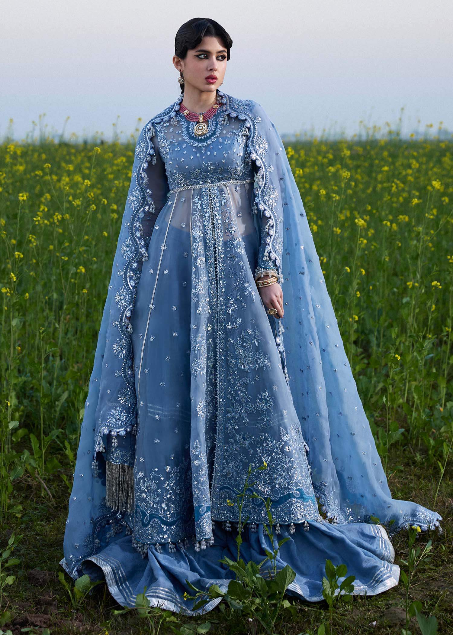 PRODUCT DETAILS 4Pc Unstitched Colour: Ice Blue Product Description: It’s a front open organza peshwas. The choli and sleeves...