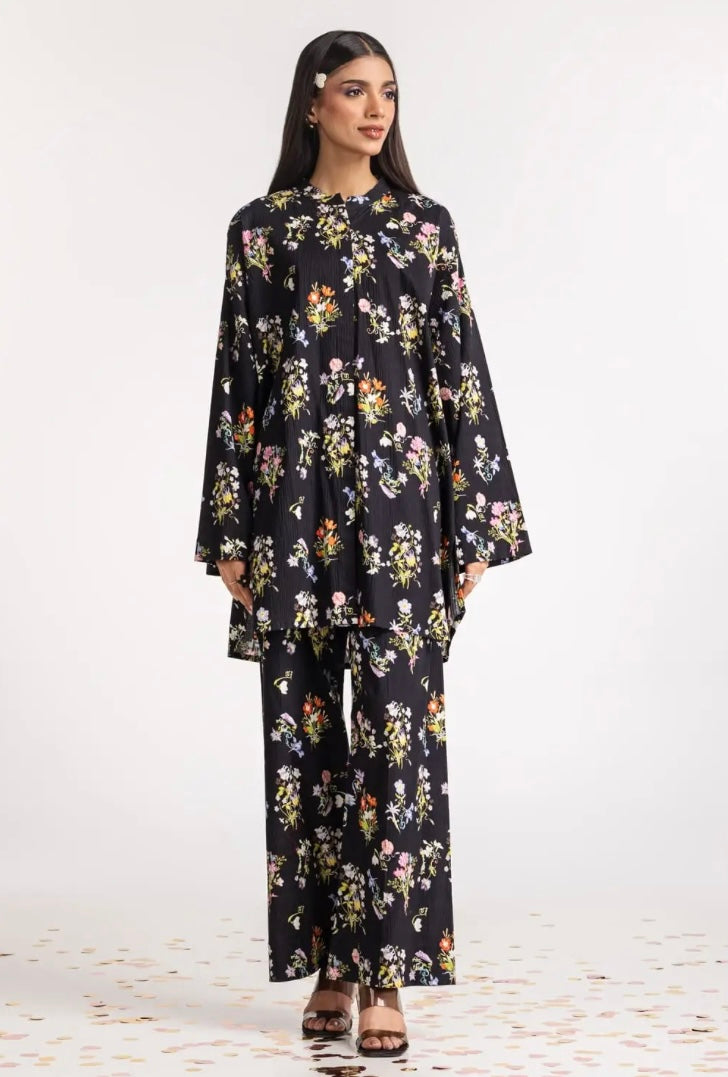 This sophisticated 2PC black ensemble is adorned with delicate floral prints in pastel hues. The kurta features a loose, flowy silhouette with full sleeves and a round neckline, paired with matching wide-leg trousers. Perfect for a chic and elegant look.