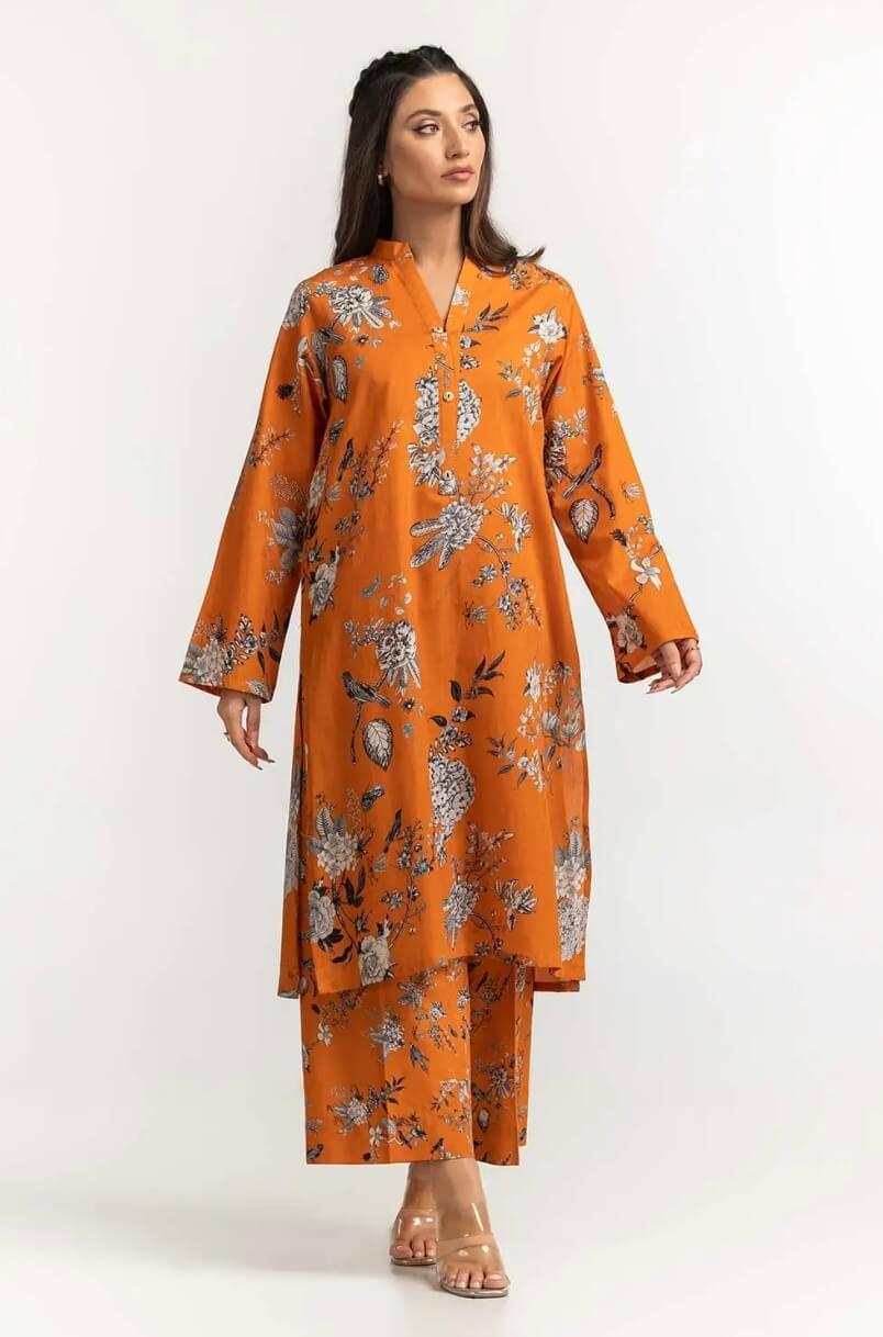 Add a pop of color to your wardrobe with this vibrant 2PC orange floral print kurta, featuring a V-neckline and full sleeves. Paired with matching pants, this ensemble is perfect for both casual outings and festive occasions.