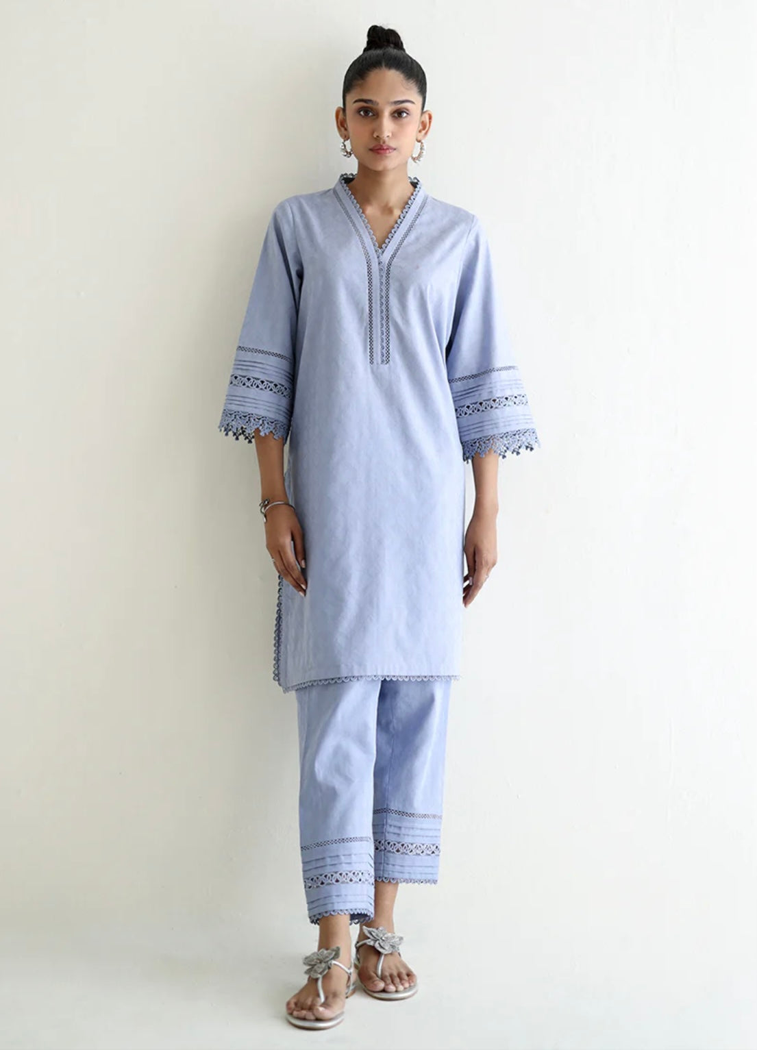 Airy Blue kurta in textured jacquard fabric with pintux and lace embellishments. V-neckline, three-quarter sleeves, and a straight silhouette comes with cotton pants embellished with pintux and lace.