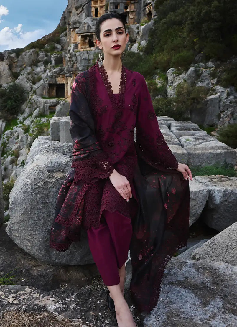 Delara in Berry from our Lawnkari ’25 Collection. A cutwork embroidered cotton lawn 3-piece outfit paired with digital printed silk dupatta.