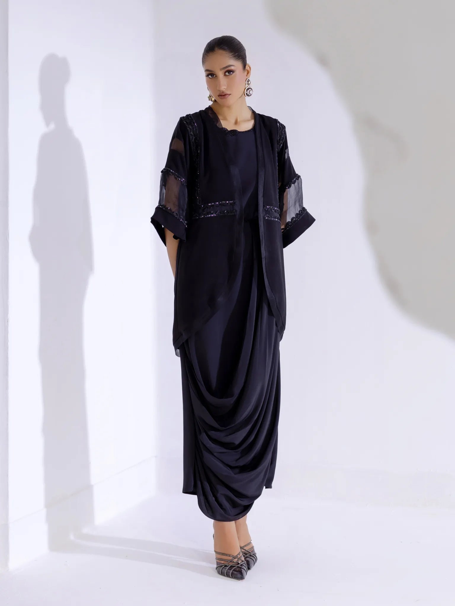 PRODUCT DETAILS 2PC Ready to wear Black short cape with organza trim and beaded lace appliqué. Long...