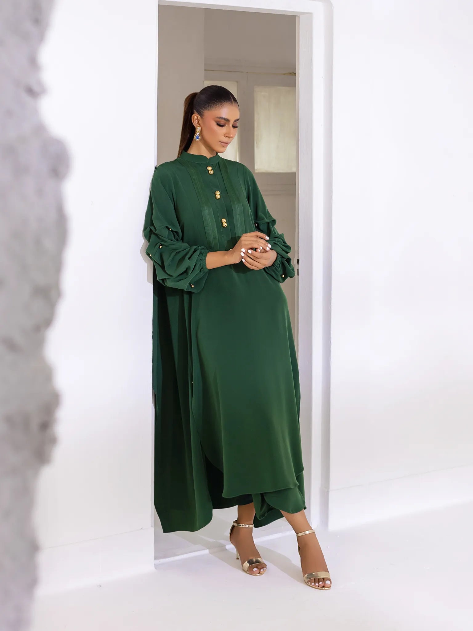 PRODUCT DETAILS 2Pc Ready to wear Emerald green ruffle sleeves long shirt with overlap pleated back. Culottes...