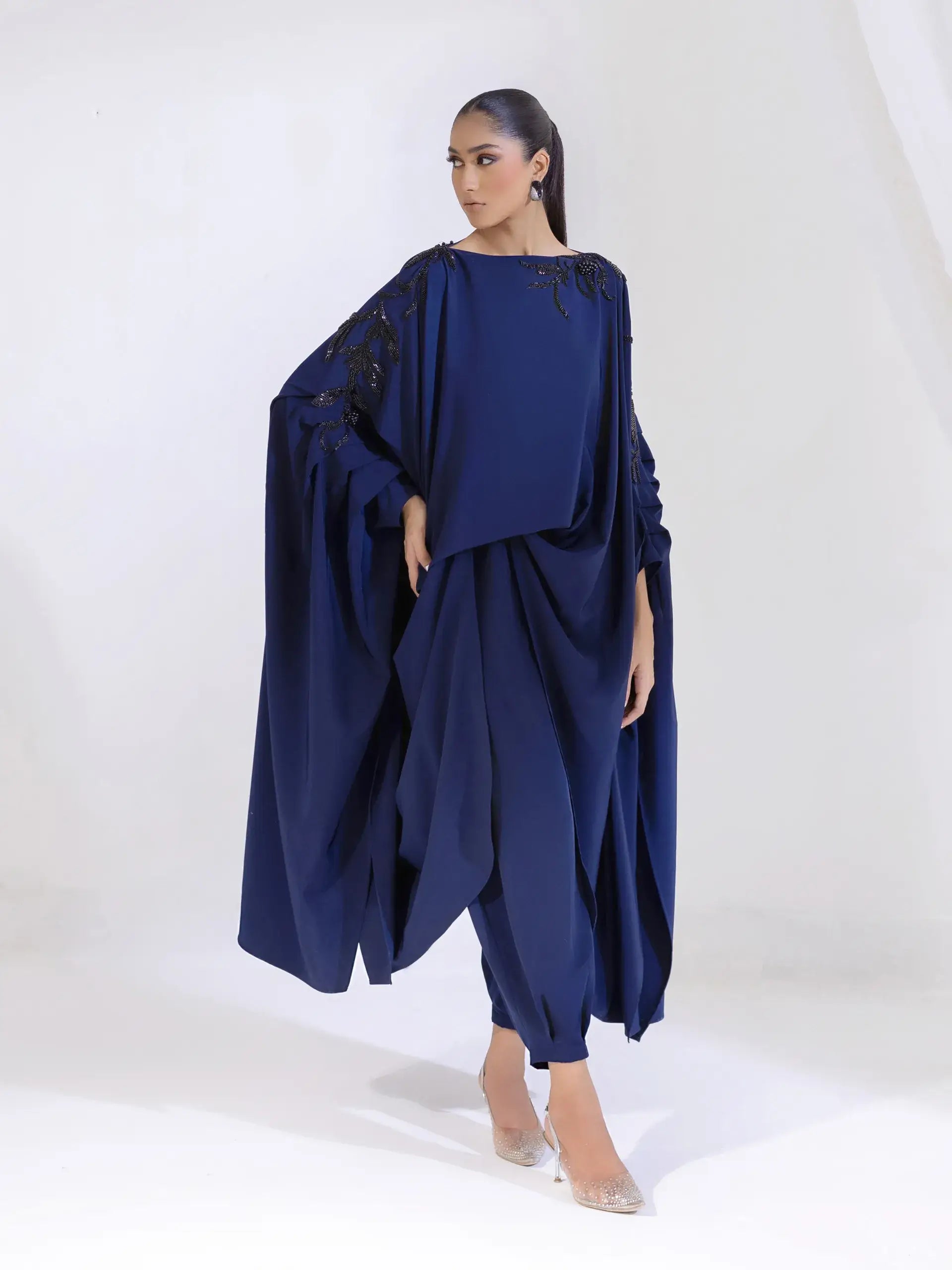 PRODUCT DETAILS 2PC Ready to wear Navy blue high low top with fully black beaded appliqué...