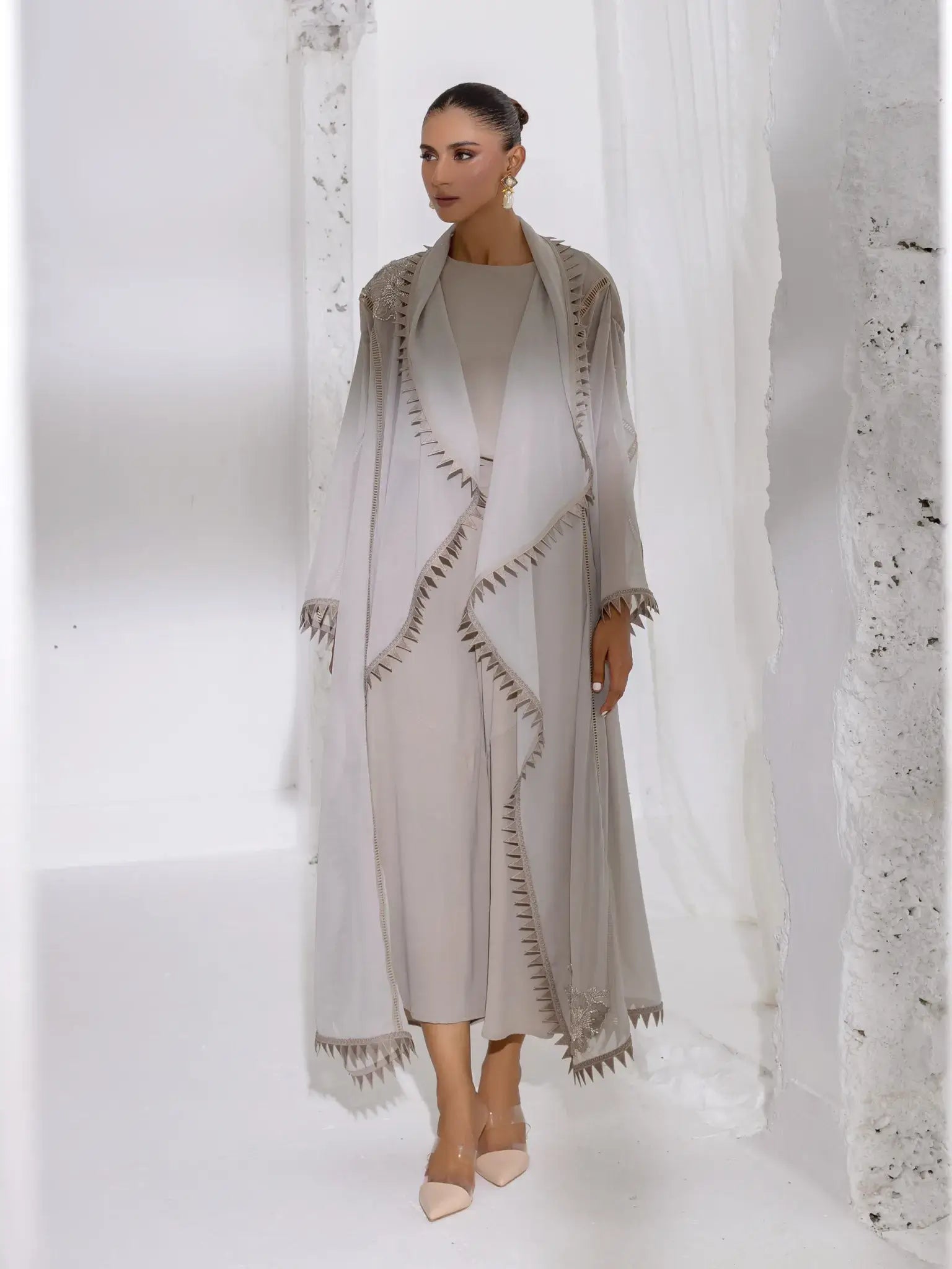PRODUCT DETAILS 3Pc Ready to wear Faded sage grey oversize lace trim cape with beaded lace appliqué....