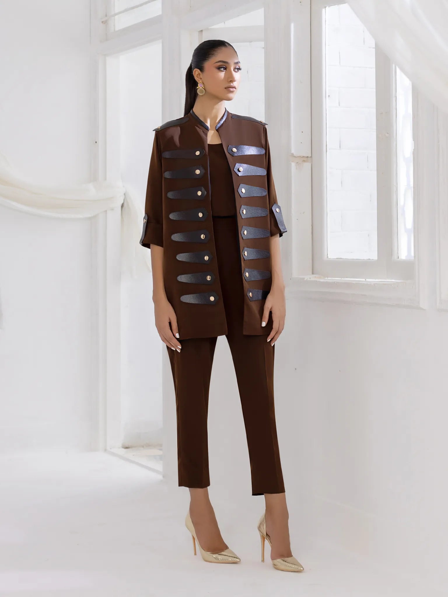 3Pc Ready to wear Chocolate brown military style jacket with leather trims. Slip and Trouser included...