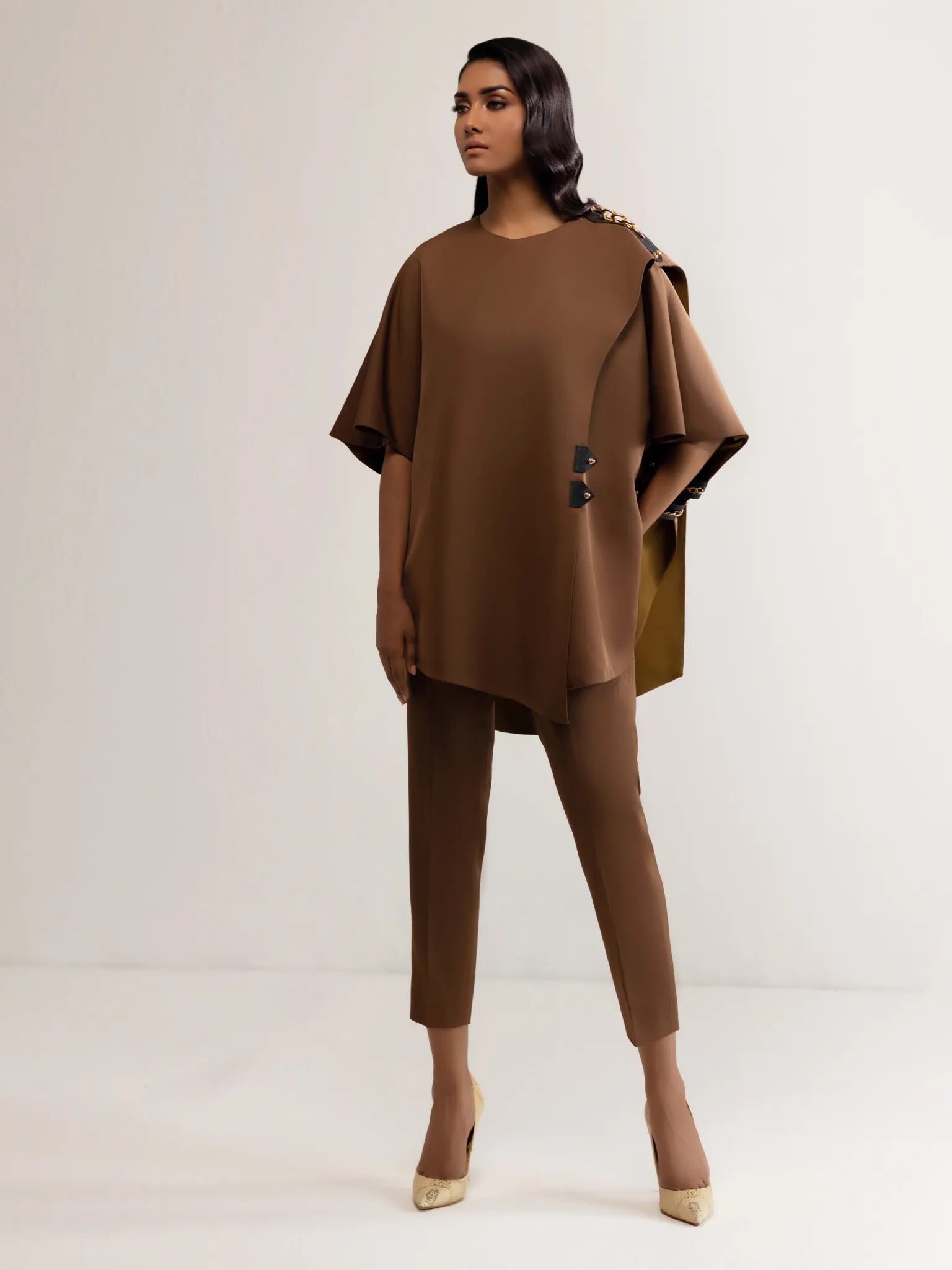 3Pc Ready to wear Taupe oversize cape with ink blue lining embellished with leather trims with...