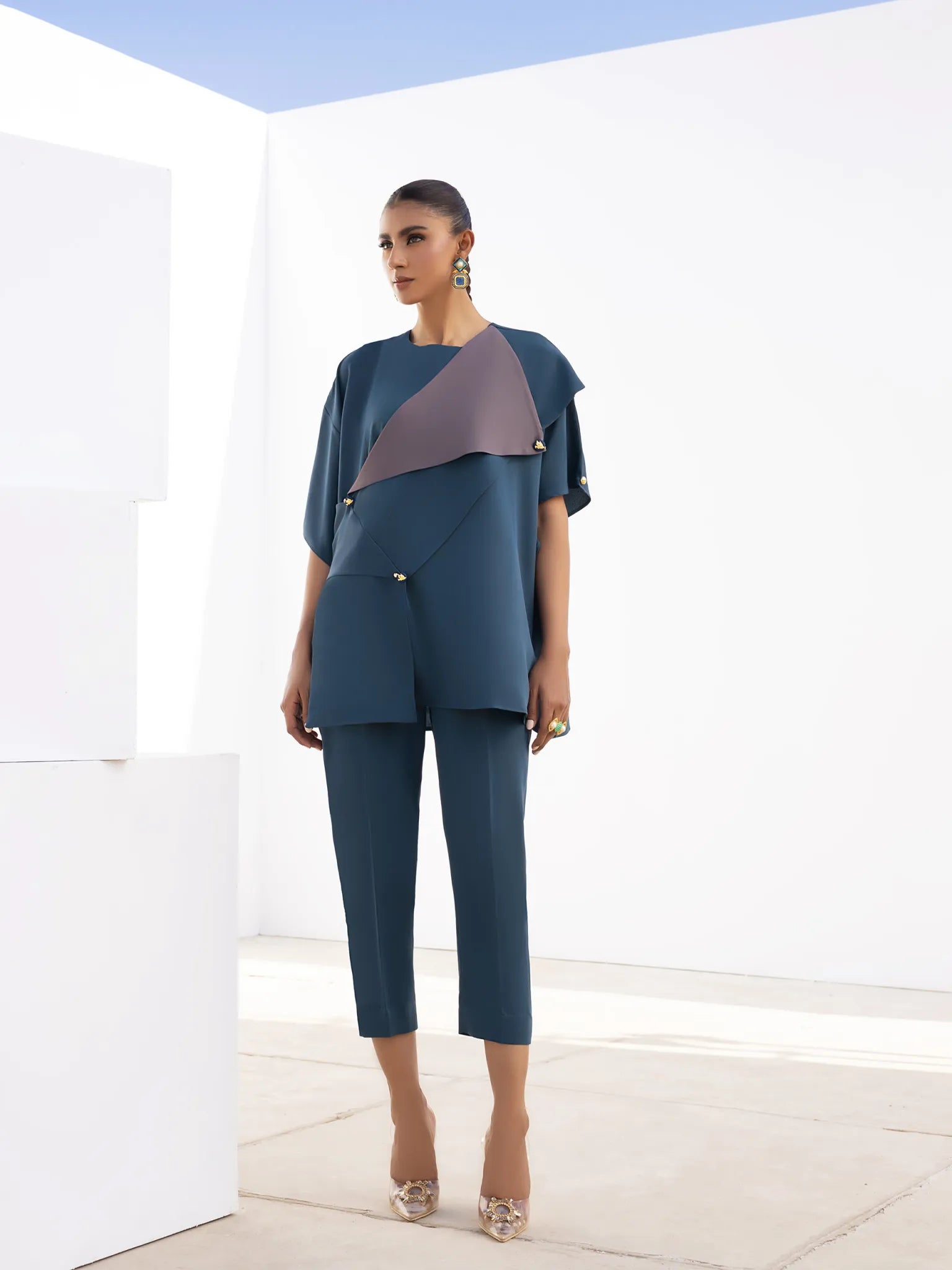 PRODUCT DETAILS 2PC Ready-to-wear Abstract cut teal green and grey top. Straight trouser included Fabric: Mix Crepe...