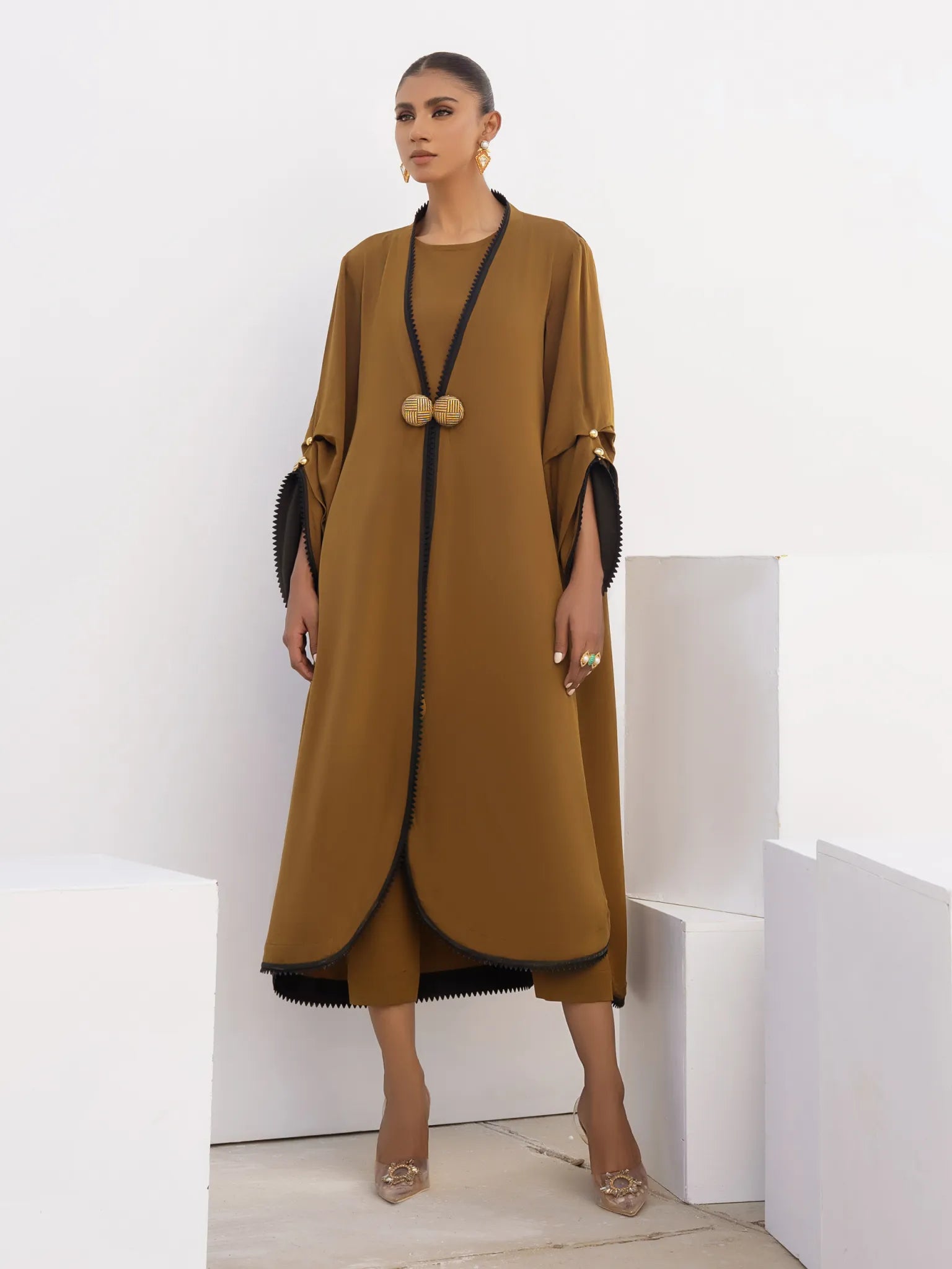 Over size long army green cape with colour block back and lace trim all over straight trouser with pleated flap included slip included.