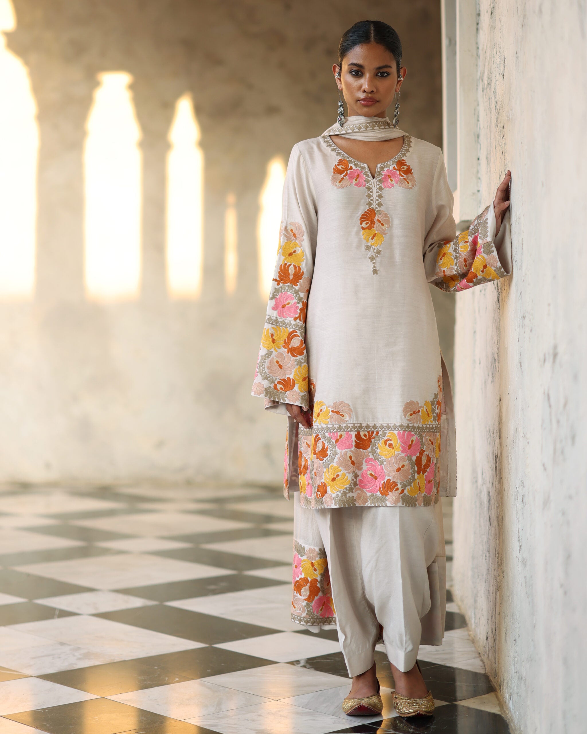 Shirt: Ivory khaddi silk short shirt with multicoloured embroidery