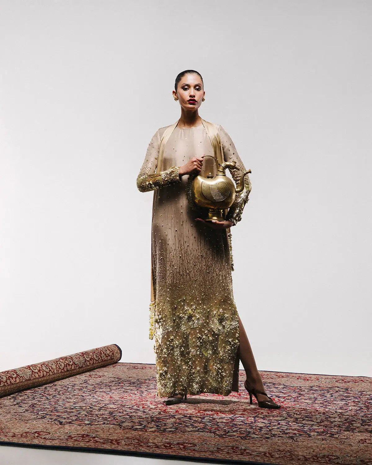 Ascent is a refined and radiant dress crafted from golden raw silk, designed to captivate with its soft, natural glow. The fabric’s rich texture and shimmering quality are enhanced by delicate pearls, sequins, and intricate metal wire embellishments, which create a harmonious balance of elegance and modern artistry. The pearls reflect light with every movement, while the sequins add a subtle sparkle, giving the dress an ethereal aura. The metal wirework adds depth and structure, elevating the design with sophisticated detail. Perfect for any special occasion, Ascent is the embodiment of timeless beauty and contemporary luxury.