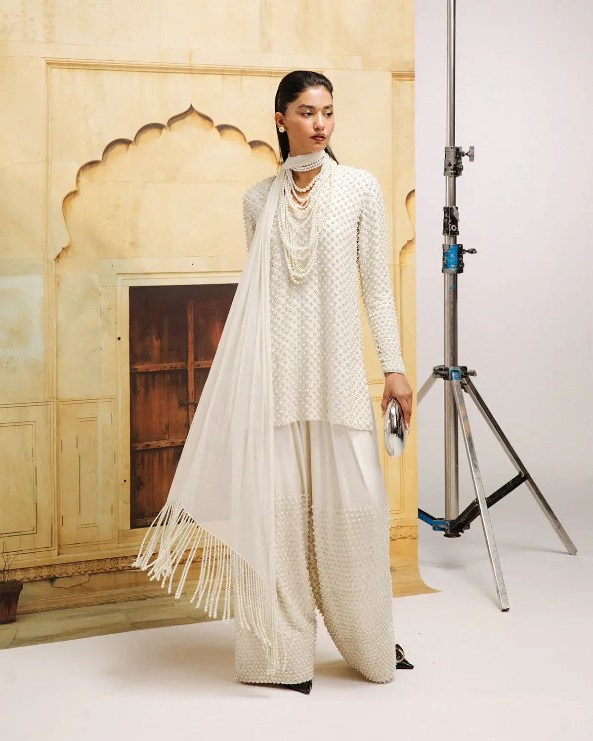 A modern ode to timeless artistry, this ivory raw silk ensemble captures the essence of understated luxury. The shirt and shalwar are meticulously adorned with pearls and crystals, creating a subtle shimmer reminiscent of Lahore’s historic elegance. The flowing dupatta, finished with delicate pearl tassels, adds a contemporary flair, making this piece a seamless blend of heritage and modern sophistication.