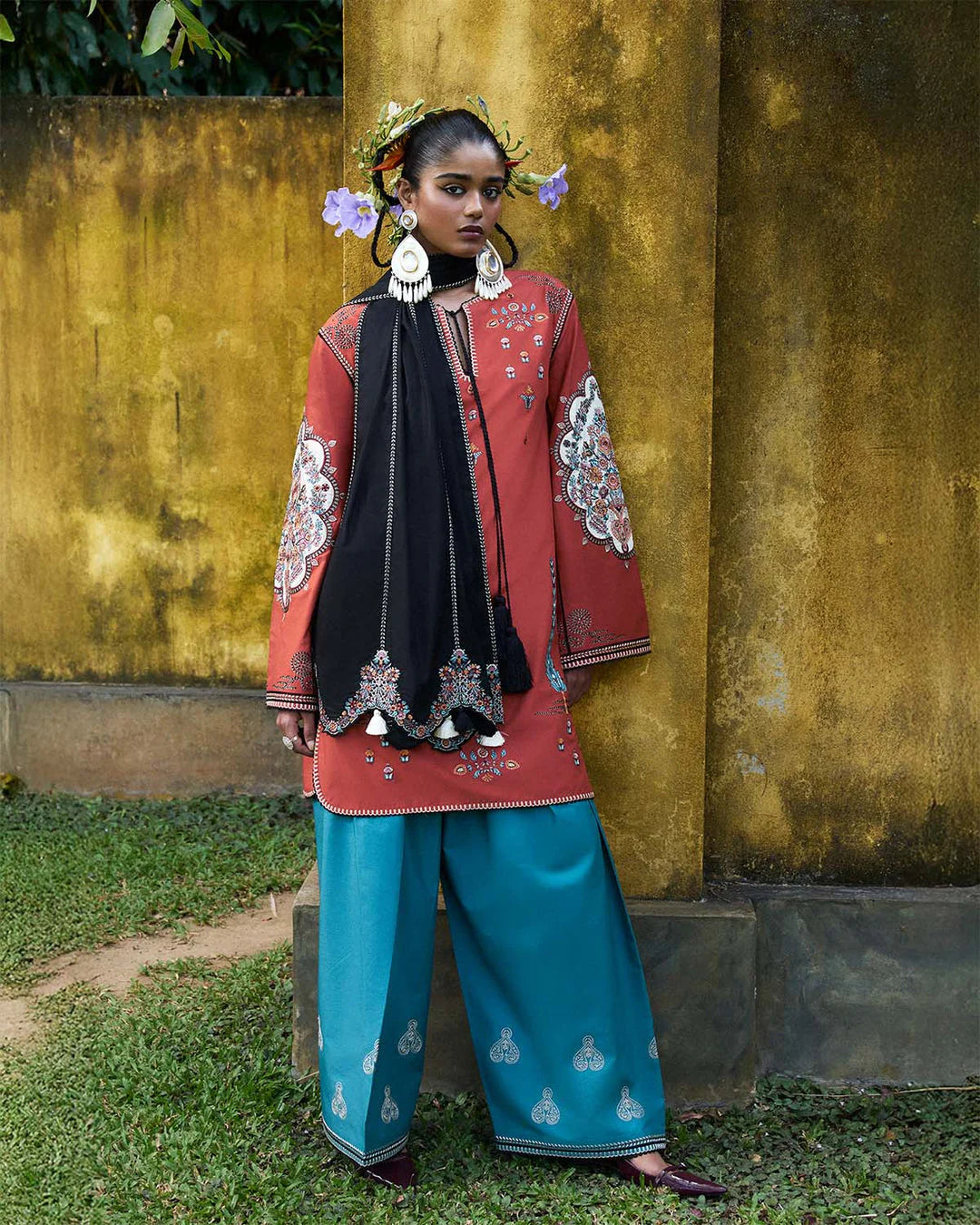 Description: A mesmerizing blend of rich hues and exquisite embroidery, this ensemble is crafted for those who appreciate fine detailing. The rust-colored short shirt is adorned with intricate multicolor embroidery, creating a vibrant interplay of patterns and textures. Delicate tassels along the hem add movement, while the straight sleeves are elevated with an embroidered patch, enhancing the overall design with a unique artisanal touch. Paired with a zinc-colored shalwar featuring monochrome embroidery, this look balances bold craftsmanship with understated elegance. The intricate tonal embroidery on the shalwar lends depth and sophistication, making it a versatile complement to the richly adorned shirt. To complete the ensemble, a black scarf embellished with intricate multicolor embroidery and playful tassels adds the perfect finishing touch. This scarf not only enhances the overall aesthetic but also ties together the vivid embroidery, creating a harmonious and eye-catching look