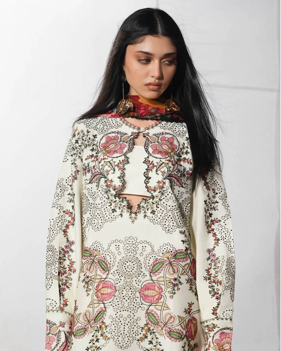 A refined ivory long shirt, lavishly embellished with multicolour traditional embroidery, embodies classic elegance, while the fitted sleeves—adorned with the same intricate motifs—add a poised and graceful structure. It is paired with a softly dyed ivory trouser that enhances the ensemble’s timeless appeal, and finished with a digitally printed silk dupatta, bringing a delicate infusion of colour, fluidity, and understated luxury to the overall look.