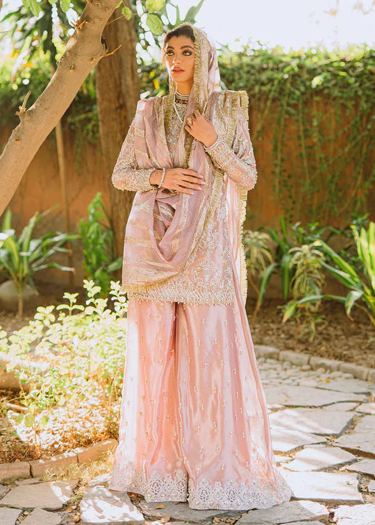 Masakali is a classic majestic look, well suited for formal occasions. This beautiful dusty lilac tissue shirt is adorned with reverie like embellishments, rendered in a glowing tilla, gotta and dabka work. Paired with gorgeously accented flowy tissue sharara with motif spray and adorned borders. The elegant look is completed with an organza badla dupatta, adding details of kiran lace, to make it an ideal festive wear.