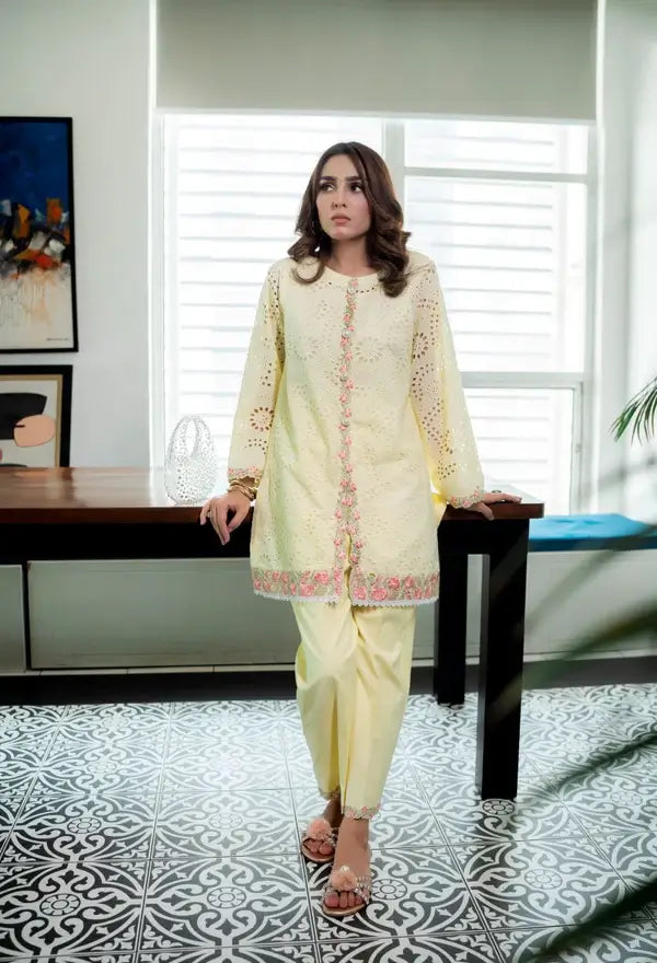 Radiate Summer Vibes With Our Gorgeous 2-Piece Set In A Soft Pastel Yellow Hue. Crafted From Luxurious Chikankari Fabric, It Features Delicate Pink Floral Resham Embroidery Along The Front Daman To Hemline And On The Sleeve Hems, Adding A Touch Of Femininity. The Classic Plain Shalwar And Four Pearls Delicately Embellishing The Neckline Ensure Timeless Elegance. Perfect For Any Summer Occasion, This Ensemble Effortlessly Blends Style And Comfort, Making You Stand Out With Its Refreshing Charm.