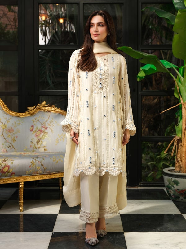 Step into refined sophistication with this pure chiffon shirt, graced by captivating blue embroidery and delicate mirror work. Paired with an embossed silk back, the pristine white outfit sets the stage for timeless elegance. The ensemble finds its completion with a dupatta featuring embossed silk finishing, adding a regal touch to your impeccable style.