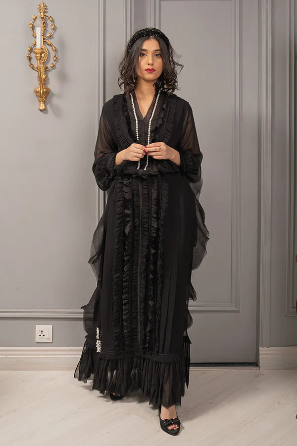 PRODUCT DETAILS 2Pc Ready to wear Fabric: Chiffon & Pure Silk Work Technique: Pearls embellished neckline ruffled details Color: Black...